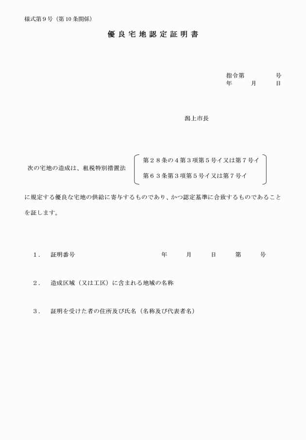 第6条 認定書の交付を受けた者は、当該造成区域(工区に分けた場合は当該工区)の全部について当該宅地の造成が完了した場合において、その造成が認定の内容に適合していることの証明を受けようとするときは、優良宅地証明申請書(様式第5号)を市長に提出しなければならない。